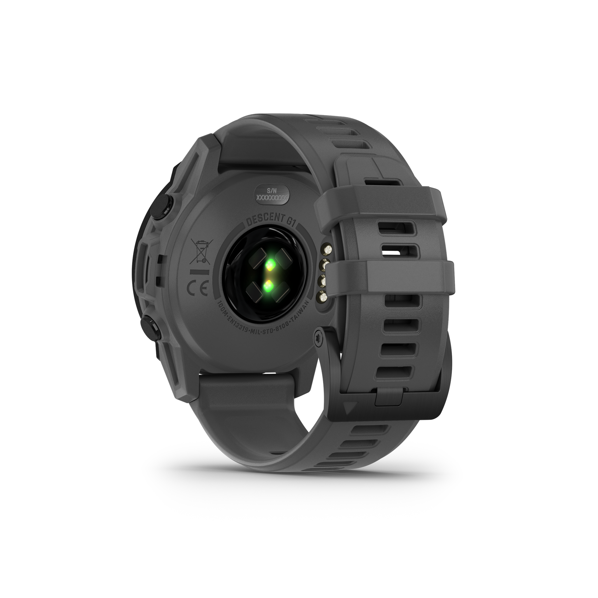 The Garmin Descent G1 has a sapphire crystal with a durable fiber-reinforced polymer bezel and case. The G1 is a quick-fit watch band compatible (22mm) and comes standard with a silicone wrist band. The instrument measures (L x W x D) 1.79 x 1.79 x 0.6" (45.5 x 45.5 x 15.2mm) and weighs 2.15 oz (61g). The included wrist band range is 5" to 8.82" (128mm to 373mm) and with the optional extra-long silicone band it has a range of 5" to 14.7" (128mm 373mm). The G1 has a custom two-window designed monochrome, sunlight-visible, transflective memory-in-pixel (MIP) display that measures 0.9 x 0.9" (23 x 23mm) with a resolution of 176 x 176 pixels. Battery life is up to 25 hours in dive mode, up to 21 days in smartwatch mode, up to 48 days in battery saver watch mode, up to 26 hours in GPS mode, up to 56 hours in maximum battery GPS mode, and up to 27 days in expedition GPS activity mode. The G1 has a memory/history of 32MB.